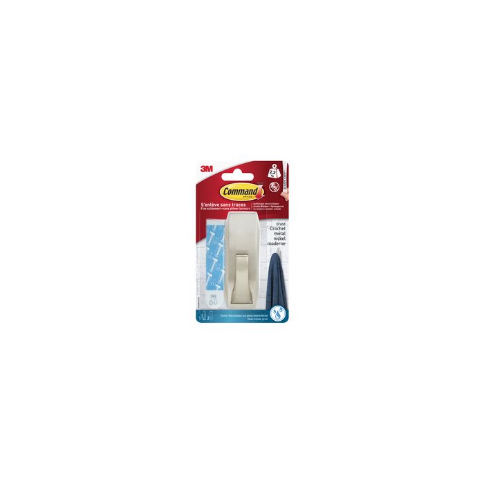 3M Command Crochet pour salle de bain métal "Modern", argenttaille: L, capacité de charge: 2,2 kg, languettes adhésives résistantes à l'eau, matériau: nickel, structure métallique satiné, forte adhérence, s'enlève sans laisser de traces contenu: 1 crochet + 2 languettes adhésives (MR03BN-BFGN)