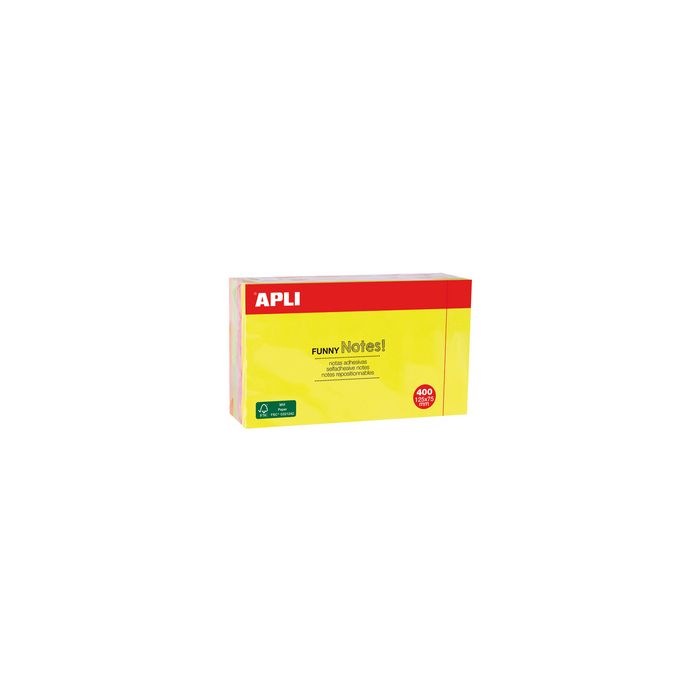 APLI Cube de notes adhésives "FUNNY Notes!", 125 x 75 mm uni, 400 feuilles par cube, assorti dans les couleurs: jaune fluo, rose fluo, bleu fluo, vert fluo (13438)