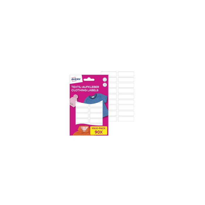 AVERY Étiquette pour textile, 13 x 45 mm, Maxi-Pack, blanc en film vinyle, autoadhésif, pour écrire à la main, résiste au lavage en machine (jusqu'à 40 degrés), passe au sèche-linge, inscriptible avec marqueur permanent contenu: 90 étiquettes sur 5 feuilles (ETVET90) assortiment Back-To-School