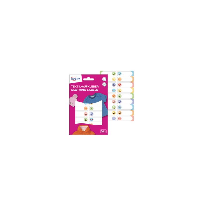 AVERY Étiquette pour textile, 13x45 mm, visage, multicolore en film vinyle, autoadhésif, pour écrire à la main, résiste au lavage en machine (jusqu'à 40 degrés), passe au sèche-linge, inscriptible avec marqueur permanent contenu: 36 étiquettes sur 2 feuilles (ETVET36E) assortiment Back-To-School