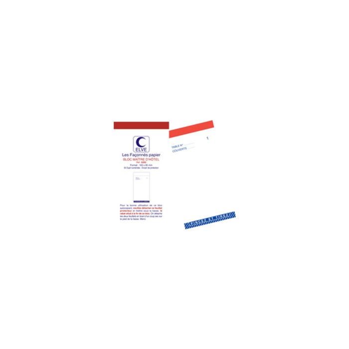 ELVE Bloc Maître d'Hôtel, 96 x 165 mm, 50 feuillets dupli ------------------ pour le marché: F -----------------------feuillets autocopiants, numérotation de 1 à 50, liasses détachables, encollées en pied, avec support rigide (2212)