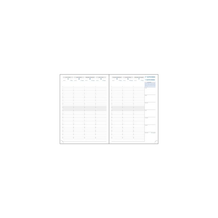 - Calendrier: 1 semaine sur 2 pages, espace pour les notes sur la droite