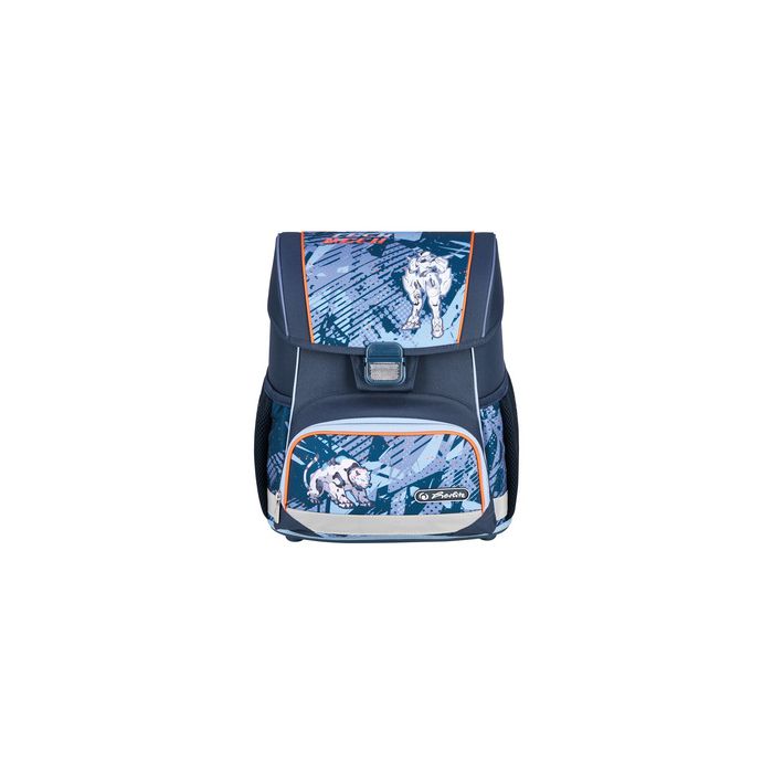herlitz Cartable Loop Plus "Tech Mech" polyester, dos rembourré ergonomique, plaque de fond solide,matériau en partie réfléchissant, fermoir à clic, bretelles réglables, sangle de poitrine réglable en hauteur, incl. étui scolaire, trousse et sac de sport (nouveau: 400197536 / ancien: 50049042) dimensions: (L)310 x (P)220 x (H)370 mm, volume: 17 L couleur: bleu/orange, motif: robot, voiture