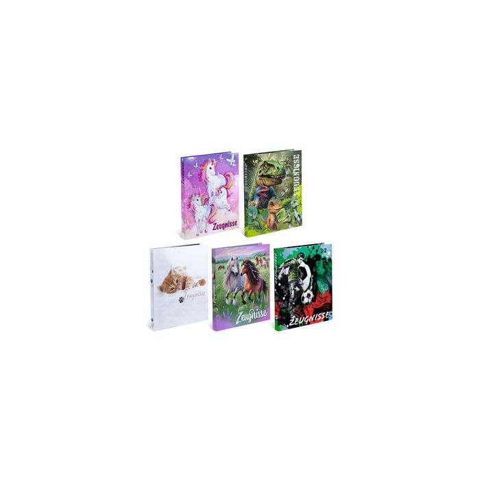 HERMA Sortiment Zeugnisringbücher, DIN A4 aus stabilem Karton, stabiles Cover, komplett bedruckt, mit Innendruck und Inhaltsverzeichnis zur Handbeschriftung, 4-Ringmechanik, Lieferung inkl. 10 Prospekthüllen beinhaltet: 10 Ringbücher sortiert in 5 Motiven (20175) Aufdruck "Zeugnisse" auf Vorderdeckel und Rücken