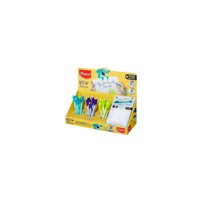 Maped Stylo roller KIDY learn, présentoir de 18 stylo d'apprentissage à encre effaçable, largeur de tracé: 0,7 mm, avec aide à l'écriture en matériau souple, assorti en 3 motifs: requin, lapin et caméléon, incl. bloc test contenu: 18 stylos (229503) assorti dans les motifs requin (turquoise / bleu clair), lapin (lilas / violet), caméléon (vert clair / vert pastel) dimensions du présentoir: (L)305 x (P)150 x (H)290 mm