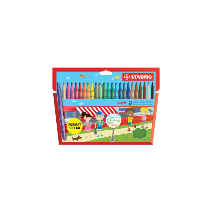STABILO Feutre power, rond, étui en carton de 24 largeur de tracé: 2,0 mm, peut rester longtemps ouvert sans sécher, encre lavable, capuchon ventilé, pointe bloquée contenu: 24 pièces (F52020) assorti dans les couleurs: violet, rose abricot, rose foncé,rose, rouge bordeaux, rouge, orange, jaune, jaune citron, vert kaki, vert clair, vert foncé, vert pin, vert,bleu clairbleu marine, bleu gris foncé, bleu électrique, beige, marron clair, marron chocolat, marron, gris, noir